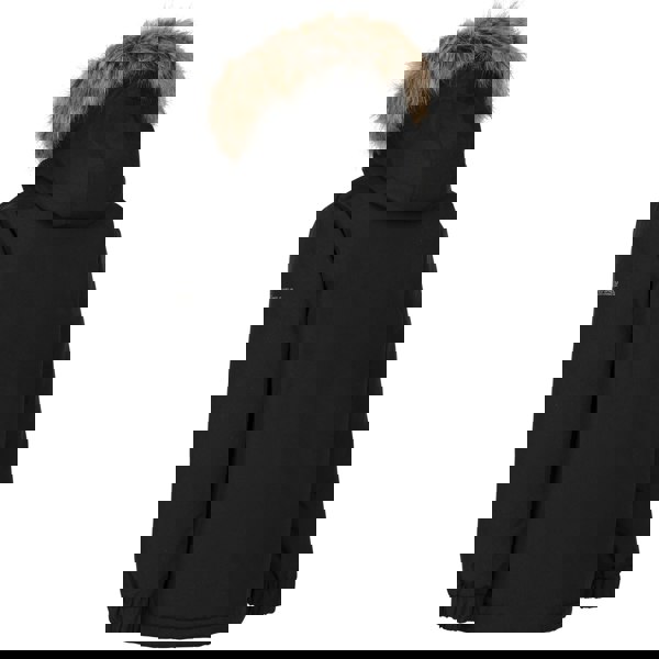 The plain black design includes contrast detailing and a logo. The neckline has a standing collar and a hood. The hood and faux fur trim detach for a change of look. A zip fastening sits under a stormflap, and two side pockets close with zips.