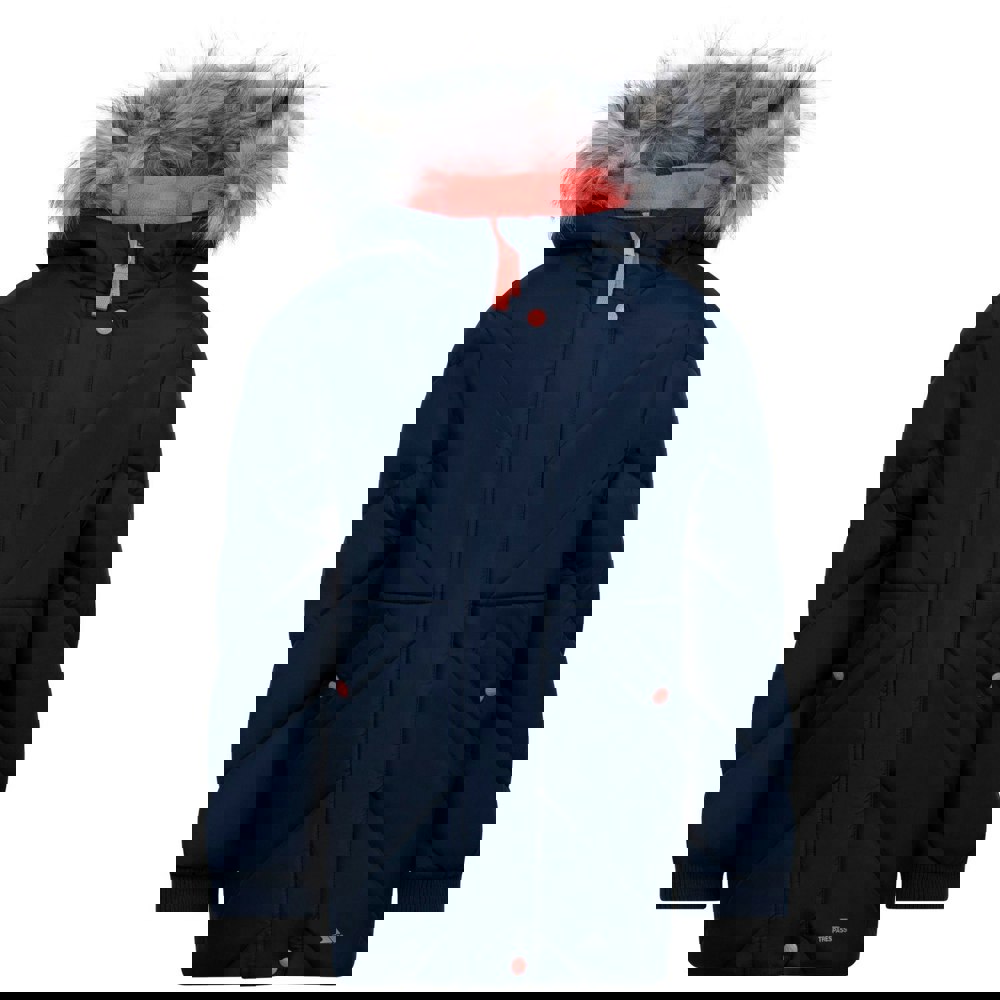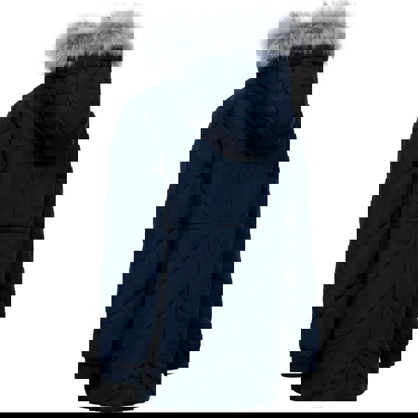 This girls’ Buntee jacket comes in navy with a quilted finish and logo detail. It is made from 100% polyester with a lightweight filling and durable, insulating fabric technology. A grown-on hood with faux fur adds extra coverage, while the long sleeves are finished with fitted jersey cuffs and a soft bound edge.