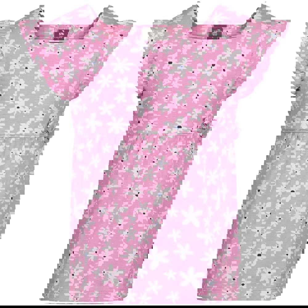 Trespass Girls Damia T-Shirt in sweet pink is made from 100% cotton with a knitted fabric construction. It has an all-over floral print and a square neckline, finished with short sleeves and frill detailing. A bow detail and gathered bust complete the look.