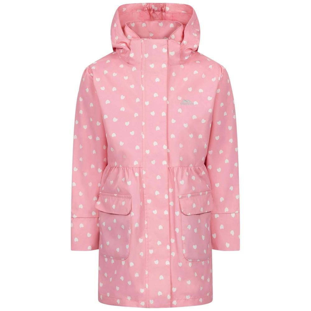 The Trespass Girls Hester waterproof jacket comes in baby pink with an all-over polka dot print and logo detail. Made from 100% polyester, it uses PVC coated woven fabric and includes taped seams. A hooded neckline and long sleeves complete the outerwear shape, with a detachable hood that is sewn on.