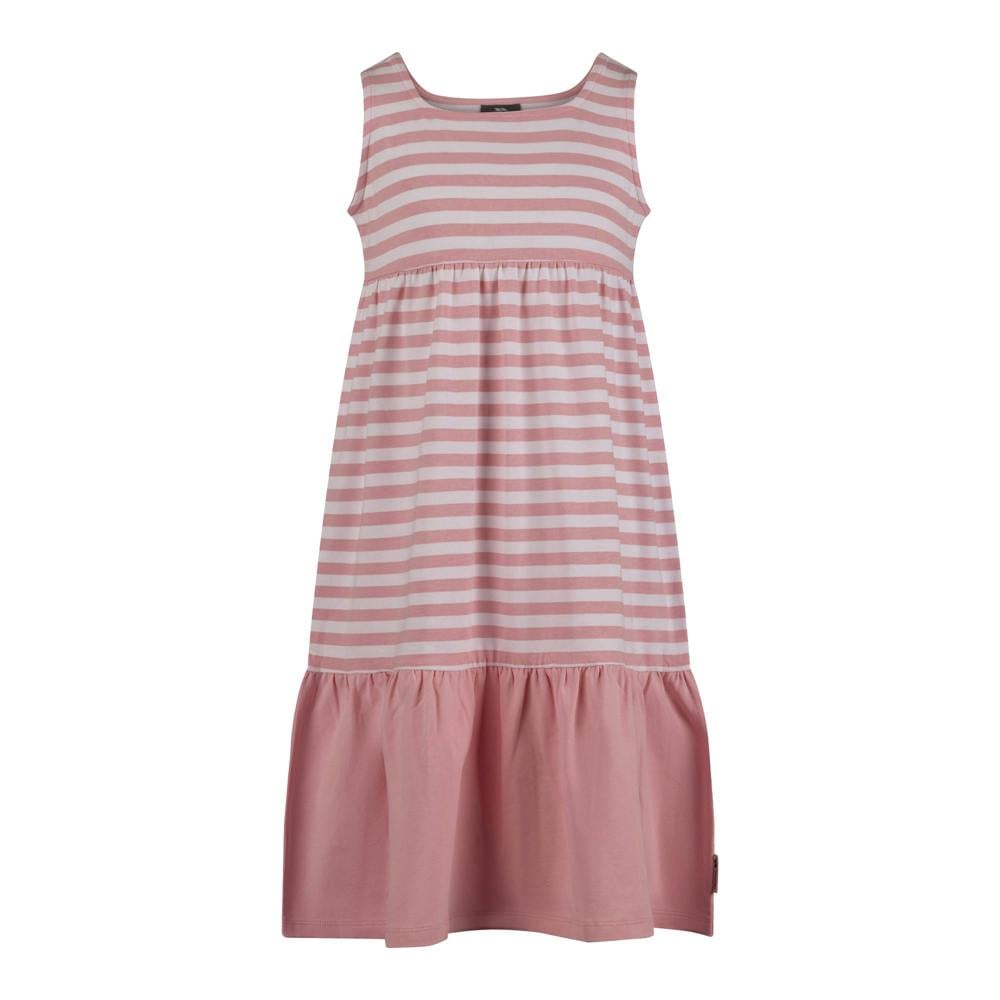 The Trespass Girls Keoni Dress comes in baby pink with a striped, two tier design. Made from knitted fabric with 95% cotton and 5% elastane, it has a breathable fabric technology. A square neckline and sleeveless cut keep the shape clean and simple, while the flared hem adds movement to the skirt.