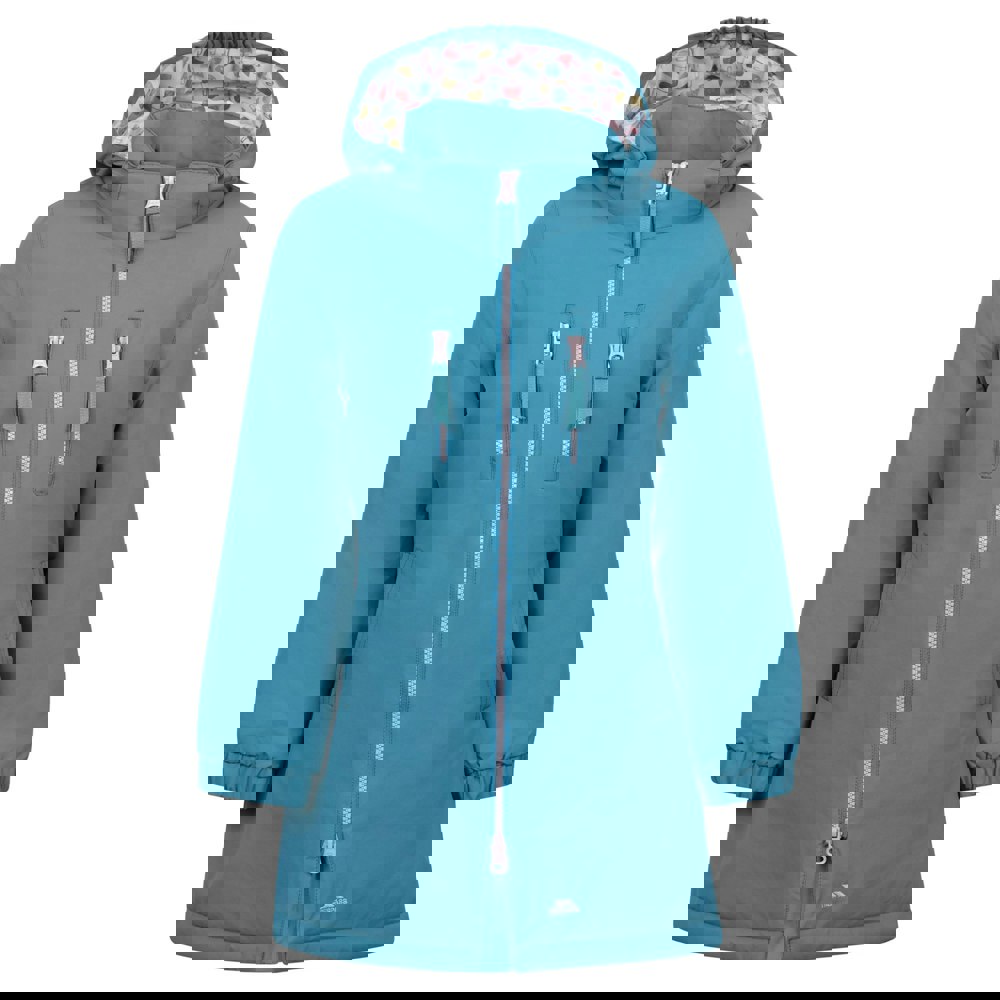 This girls’ Marybank raincoat from Trespass comes in light teal with a plain finish and logo detail. The outer is 100% polyamide with a PU shell, plus a 100% polyester lining and 100% polyester filling. A padded construction and long length create a practical layer for wet-weather wear.