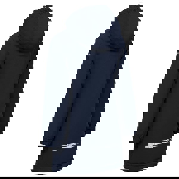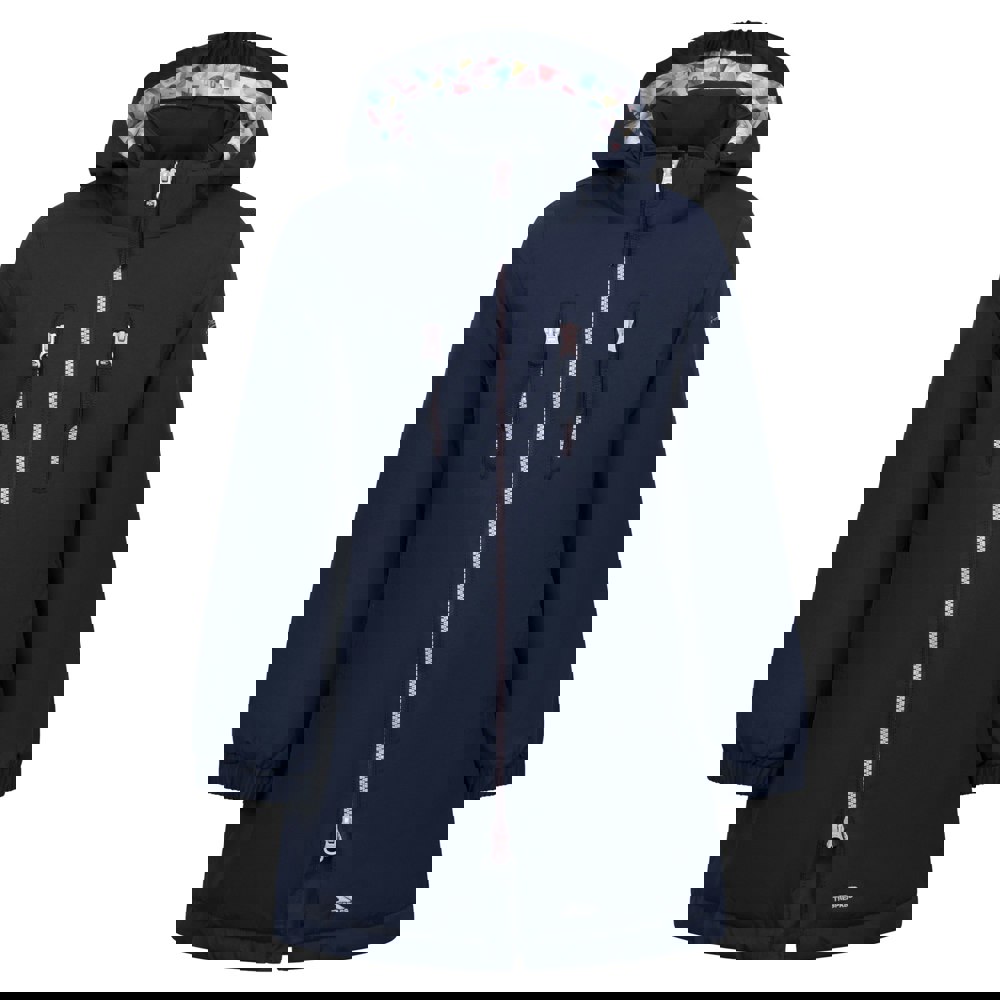 The Trespass Girls Marybank raincoat in navy has a plain finish with logo detailing and a long length. It is padded and includes a hooded neckline with a detachable hood. Long sleeves and elasticated cuffs complete the outerwear silhouette.