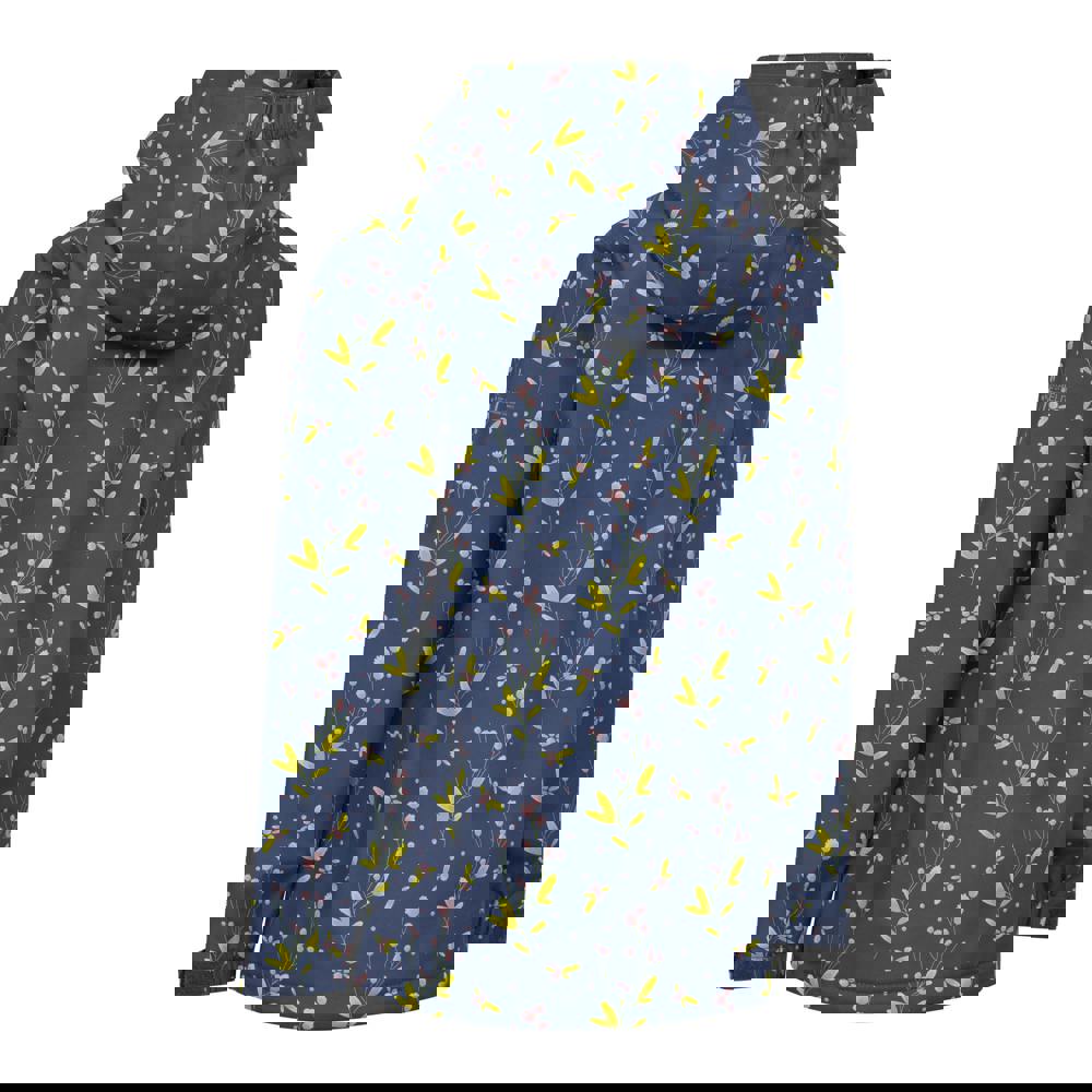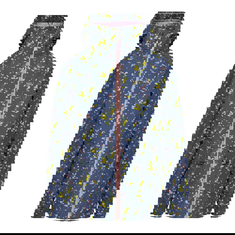 The Trespass Girls Micaella Waterproof Jacket in Bluestone is made from 100% polyester with a PVC woven fabric and a tricot lining. It has a floral and leaves design, with a hooded neckline and long sleeves. The jacket includes taped seams and a full zip fastening.