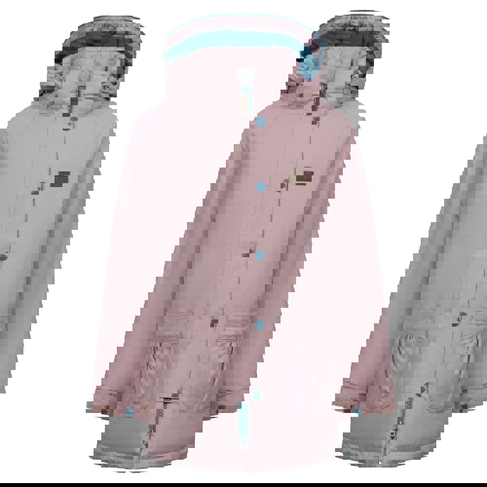 The hooded neckline includes a detachable hood. Long sleeves are finished with adjustable stud cuffs, and the dipped hem adds extra coverage at the back. Fastening is secured with a full zip, press studs and a stormflap. Two patch pockets sit at the front, each with a flap closure.