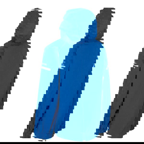 This kids’ Bluster jacket from Trespass comes in blue with a woven outer made from 100% polyester with a PVC coating and a 100% polyester lining. The lining uses a contrast striped finish, paired with a plain look and logo detail.