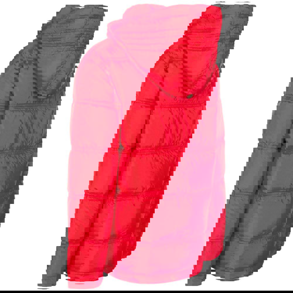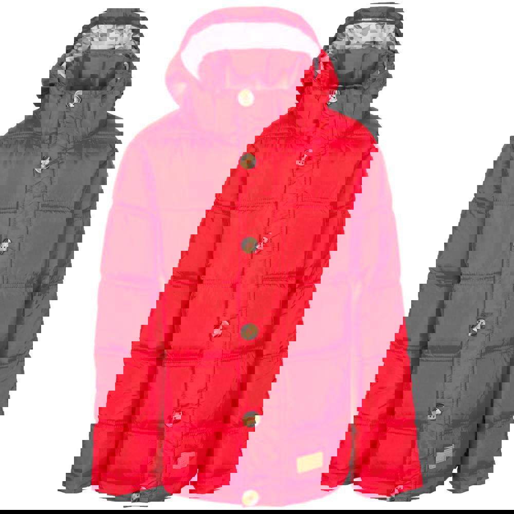 This kids’ parka comes in red with a plain, quilted finish and logo detailing. It includes a printed lining and a hooded neckline for a covered look. The hood detaches and secures with a stud-off fastening. Long sleeves complete the outerwear shape, while two side pockets add practical storage. A button fastening with a flap closure finishes the front.