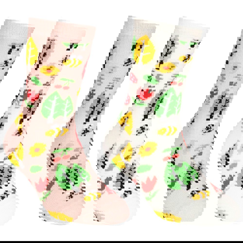 This pack of two kids’ socks comes in cream and light pink with a patterned design. The print combines bees and floral motifs for a detailed finish. Made from a cotton-rich blend with added polyester and elastane, they offer a comfort fit for everyday wear.