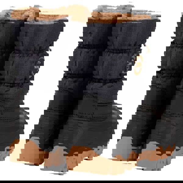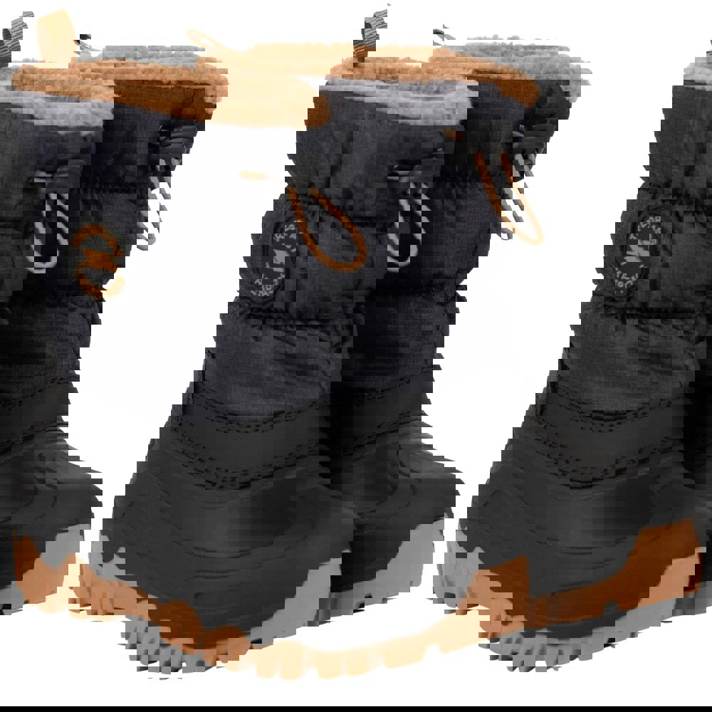 Trespass Kids Luca snow boots in navy with a slip-on design and round toe. The upper combines durable PU (polyurethane) and textile, with a fleece and sherpa lining. A platform heel and pull tab complete the practical finish, while a logo detail adds a branded touch.