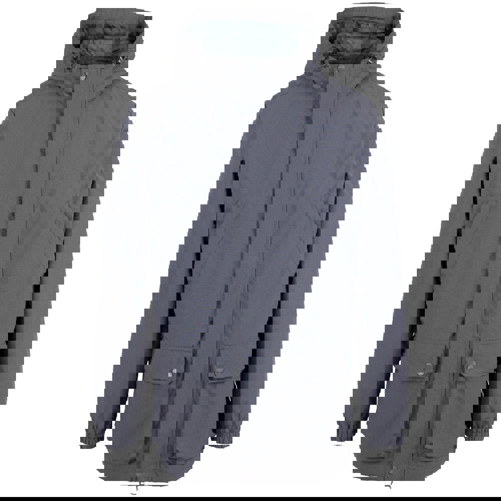 A hooded neckline includes a grown on hood with a toggle adjuster. Long sleeves are finished with elasticated cuffs, while an inner storm flap sits behind the fastening. Storage is arranged across four pockets, with two chest pockets and two cargo pockets. The front closes with a full zip, stormflap and stud fastening.