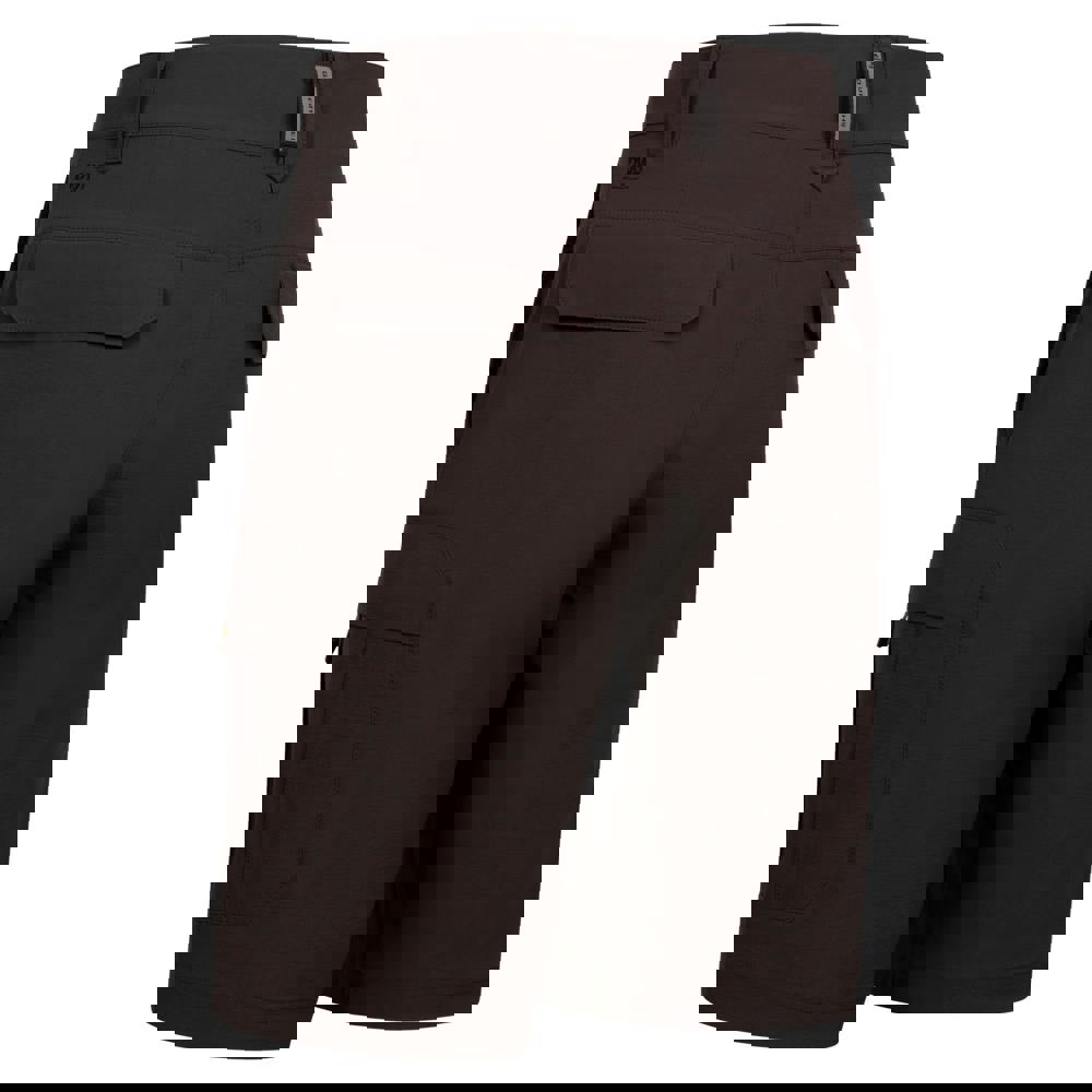 Storage is arranged across multiple pockets, including side pockets with concealed zips, cargo pockets with flap closure, and back pockets. The shorts fasten with a button and zip fly.