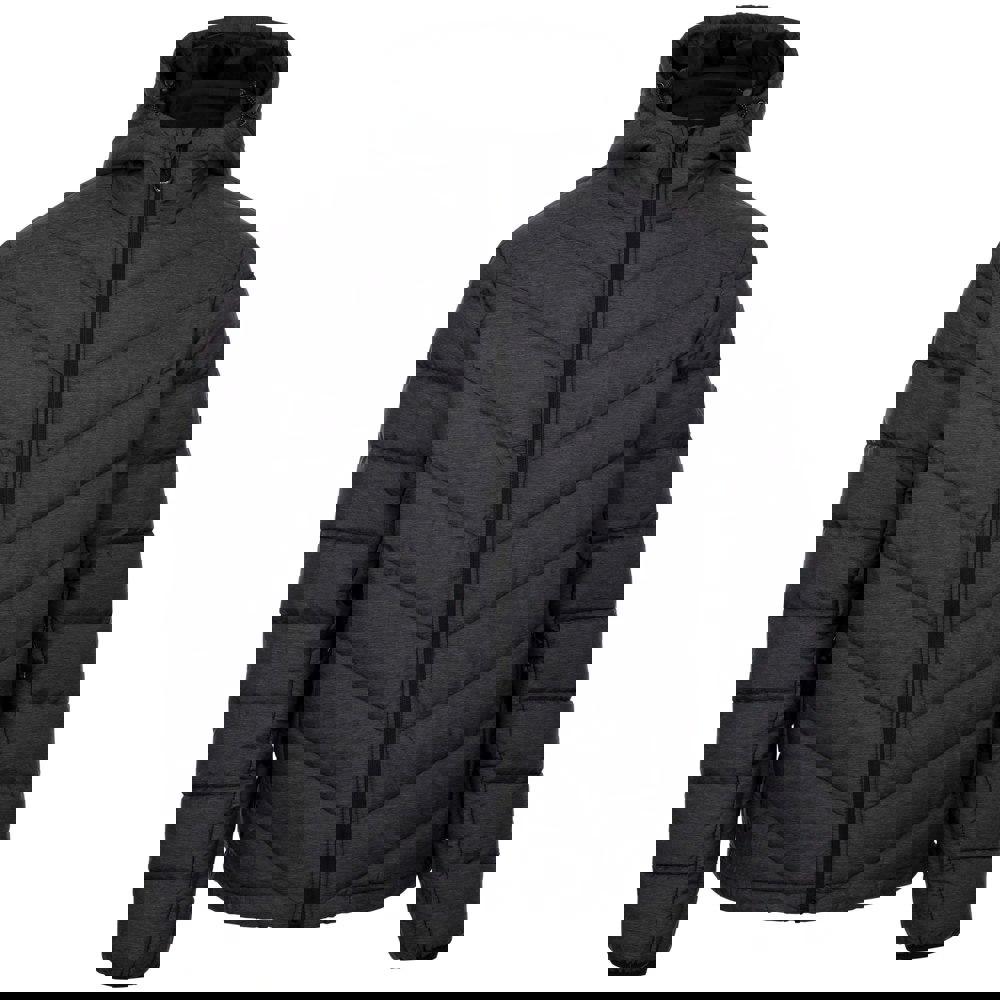 This padded jacket is made from a polyamide and polyester blend in a plain dark grey marl finish. It has a hooded neckline and long sleeves for classic outerwear coverage.