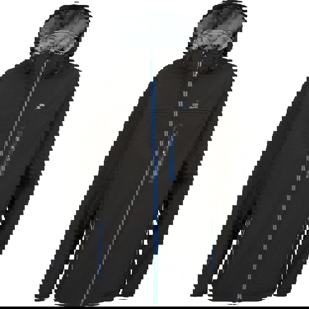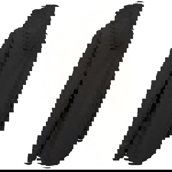 This men’s Hebron softshell jacket comes in black with a TPU membrane and a waterproof rating of 8000mm. The fabric blend combines 94% polyester with 6% elastane, and the construction is windproof with breathability rated at 3000mvp. An adjustable hood zips off for a change in coverage, while a chin guard adds protection at the top of the zip.