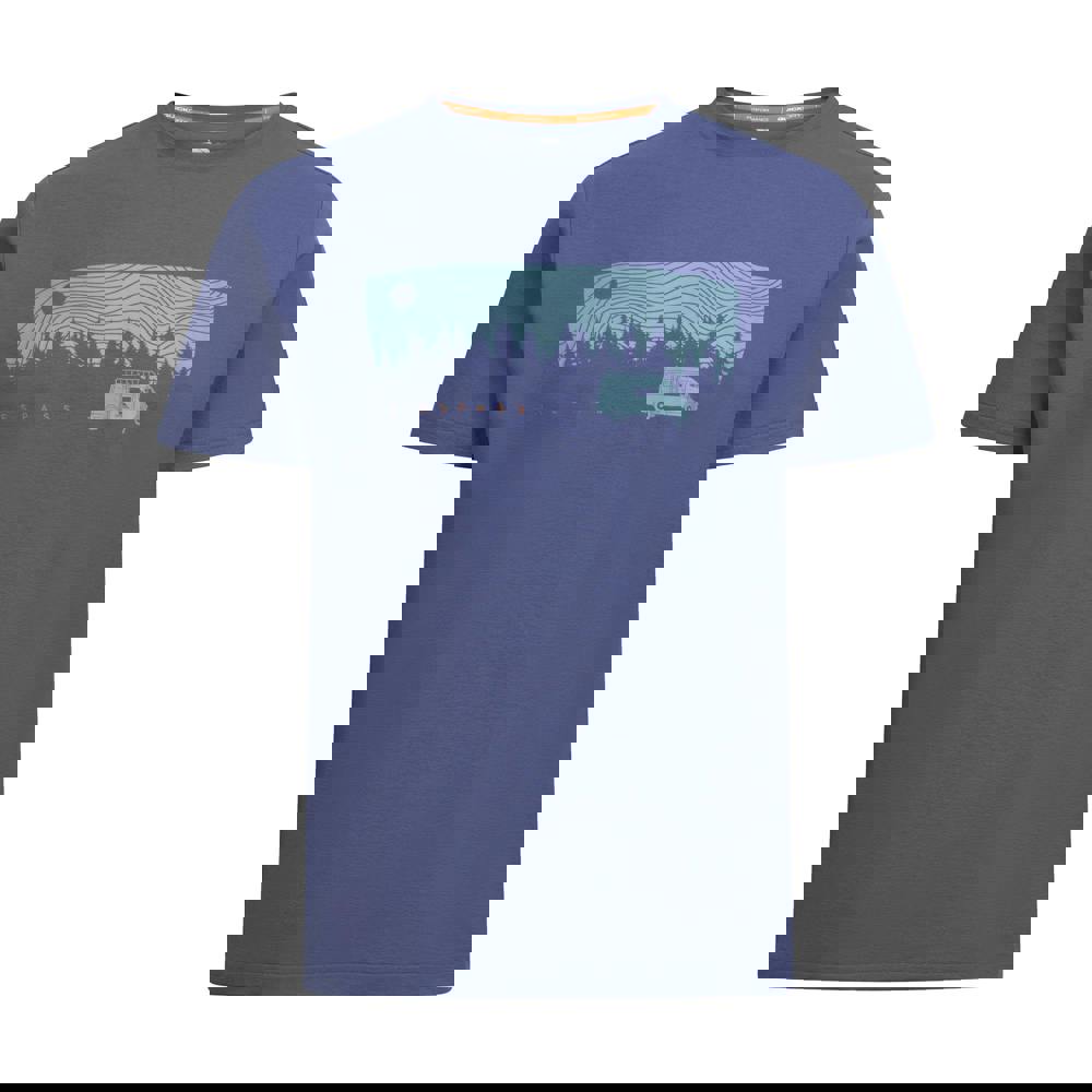 This men’s Jacub casual T-shirt comes in coastal blue with a printed design and a classic crew neckline. Made from 100% polyester with a knitted fabric construction, it is finished with short sleeves and side seams for a clean, structured look.