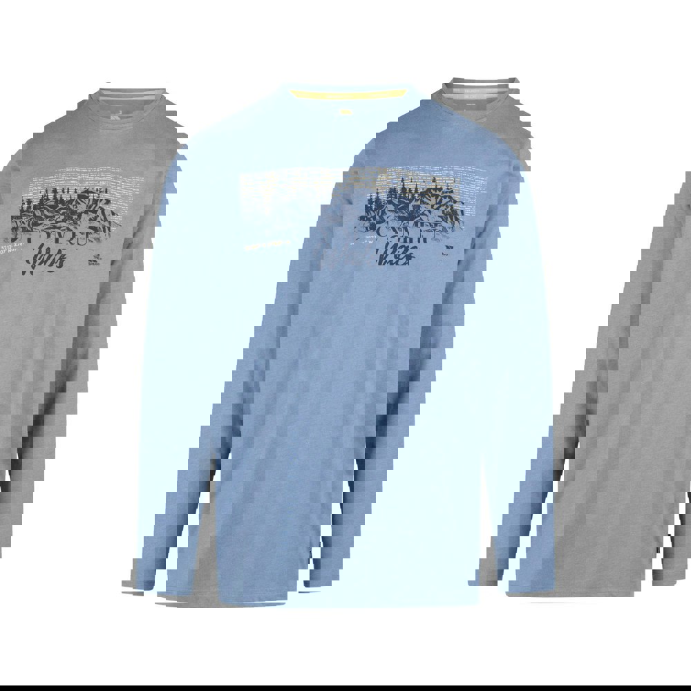 Made from a cotton and polyester blend, this long-sleeved T-shirt is finished in a denim blue marl. It has a crew neck and a printed design combining a mountain graphic with text.