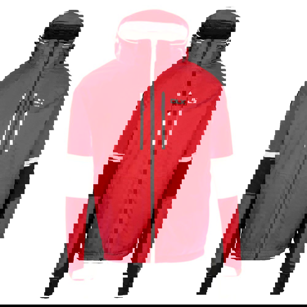 A hooded neckline and long sleeves create a practical cold-weather profile. The hood adjusts and zips off, while the cuffs are adjustable with an inner stretch finish. Storage is organised across two lower pockets, two chest pockets and a dedicated ski pass pocket, alongside zipped compartments including a goggle pocket and an audio pocket. A full zip fastening and an adjustable drawcord hem complete the construction.