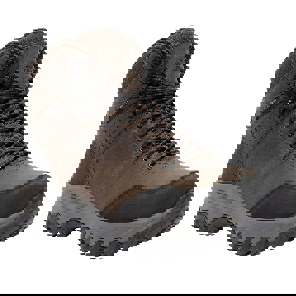 These men’s Stride walking boots from Trespass come in dark brown with an ankle-high cut and a plain finish. The upper combines leather, other materials and textile, with a textile lining. A lace-up fastening runs through 8 eyelets, and the round toe is finished with a rubber toe cap.