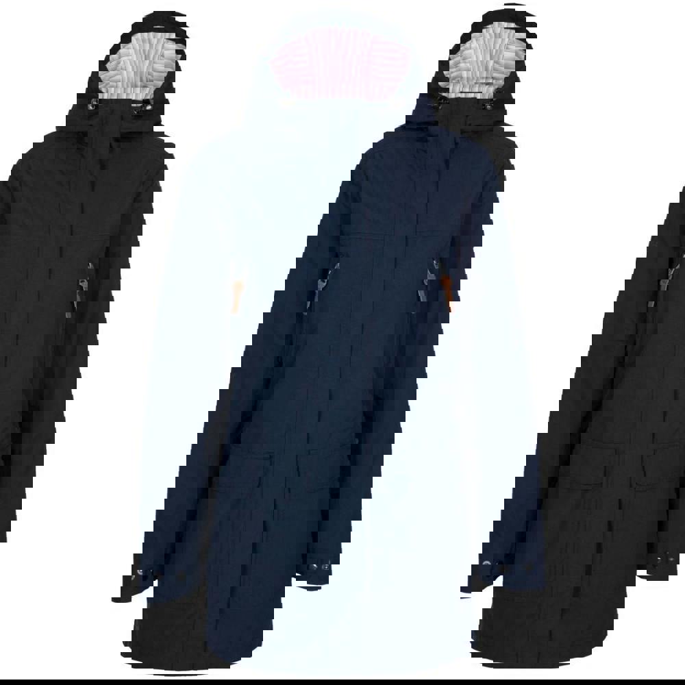 This long women’s jacket comes in a plain navy design with a printed lining made from 65% polyester and 35% cotton. It has a hooded neckline with a grown on hood and long sleeves, finished with adjustable cuffs secured by studs.