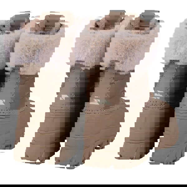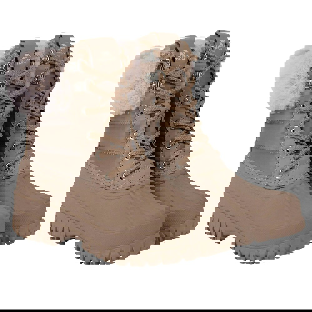These women’s Briony snow boots from Trespass come in beige with a plain design and an ankle cut. The upper combines durable PU (polyurethane) with textile, while the lining uses plush, soft faux fur in textile for added comfort. A lace-up fastening with six eyelets secures the fit, finished with a round toe and a platform heel.