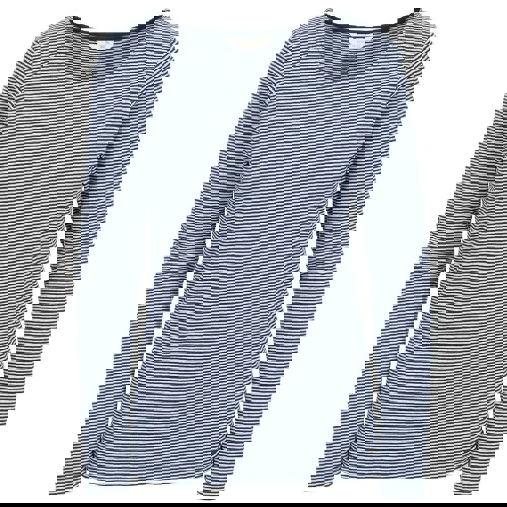 This yarn-dyed stripe top is finished in a navy marl colourway and cut with a wide neck for a clean, open neckline. A contrast inner neck binding adds a neat internal detail, while a pleat at the back brings subtle shape to the silhouette. Made from a cotton-rich blend with added elastane, it offers a comfortable option for casual wear.
