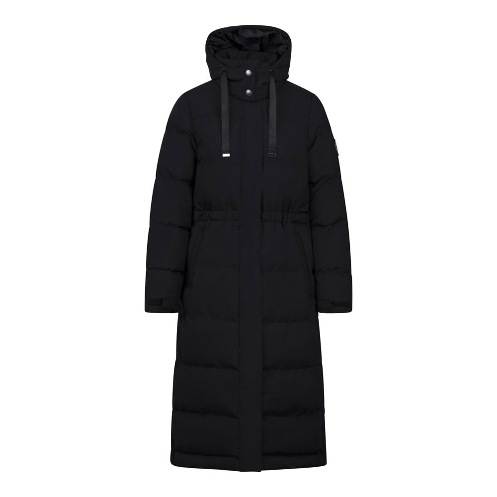 Built for wet-weather wear, this longline jacket combines a woven polyester shell with a TPU membrane and faux down filling. The quilted finish is paired with a hooded neckline and standing collar, plus a badge and logo detail for a clean, branded look.