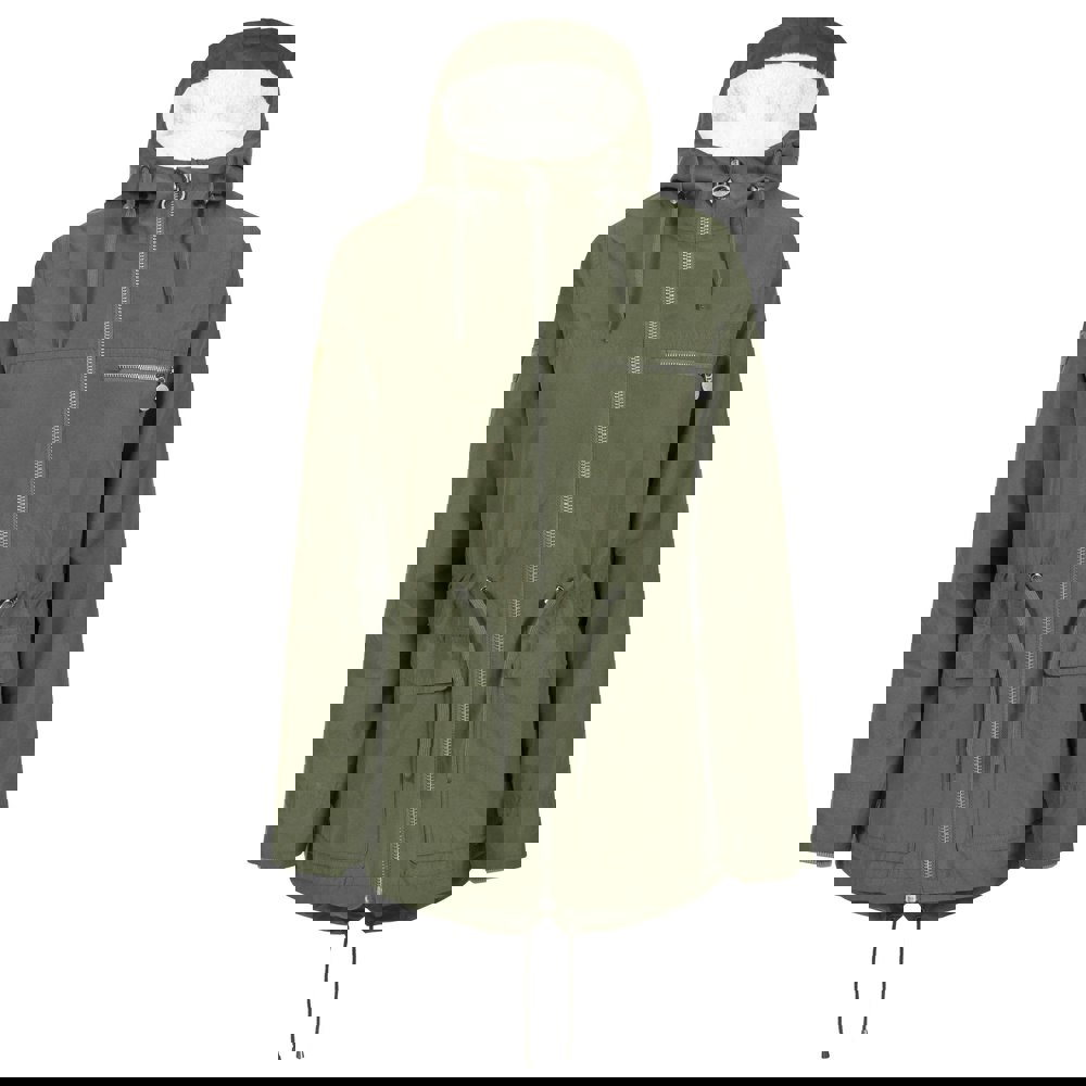 This waterproof parka jacket is finished in moss and built with a sherpa fleece lined grown-on hood and a chin guard for added coverage. A lightly padded printed taffeta lining sits inside, alongside taped seams and a windproof construction. The outer uses 100% polyester satin peachskin with a TPU membrane, with 100% polyester lining and 100% polyester filling.