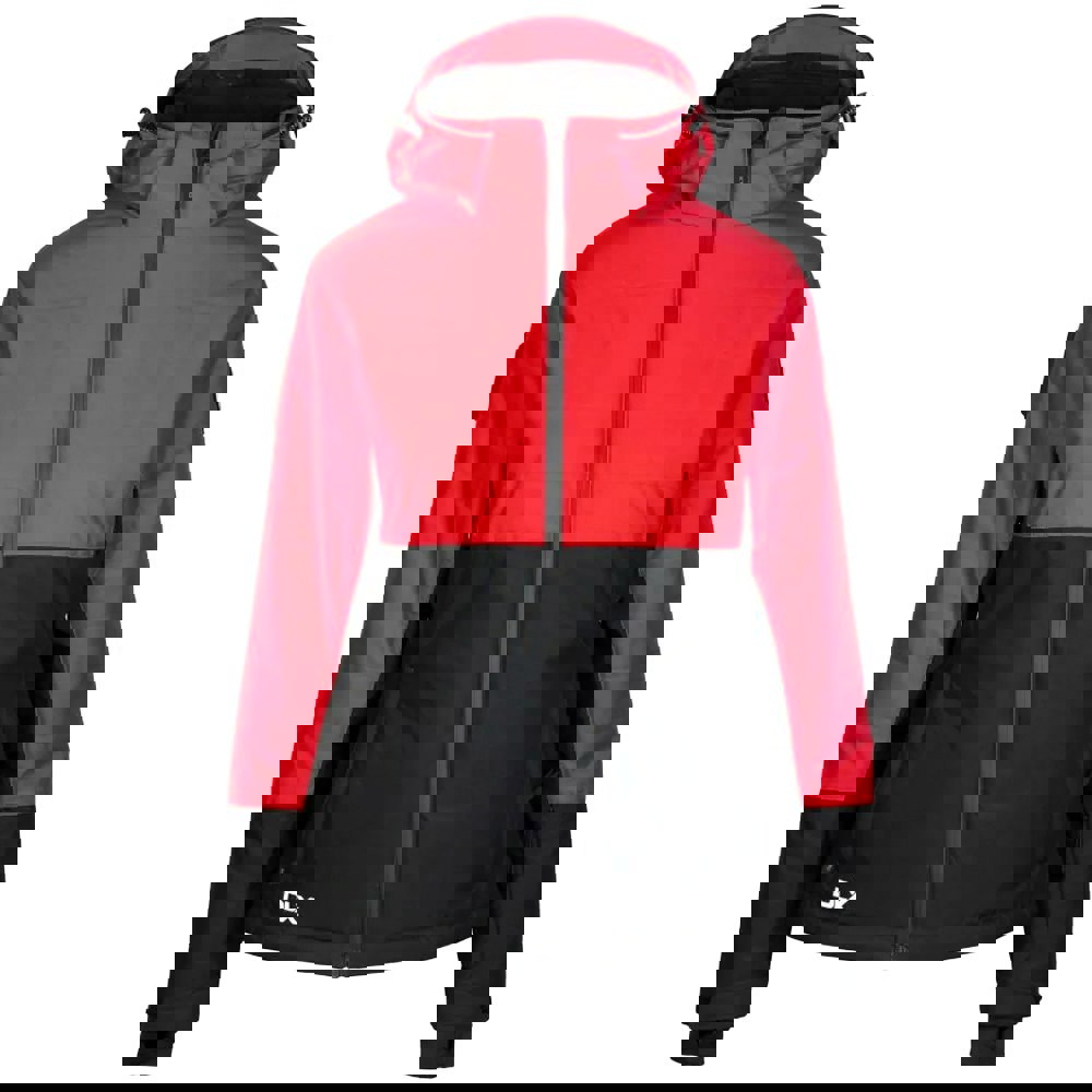 This women’s Jaclyn DLX ski jacket from Trespass is made with a 100% polyester outer and a PU membrane fabric. It has a hooded neckline with an adjustable, zip-off hood, plus long sleeves with adjustable cuffs and an inner stretch cuff. Colour block styling is finished with sleeve patches and quilted panels.