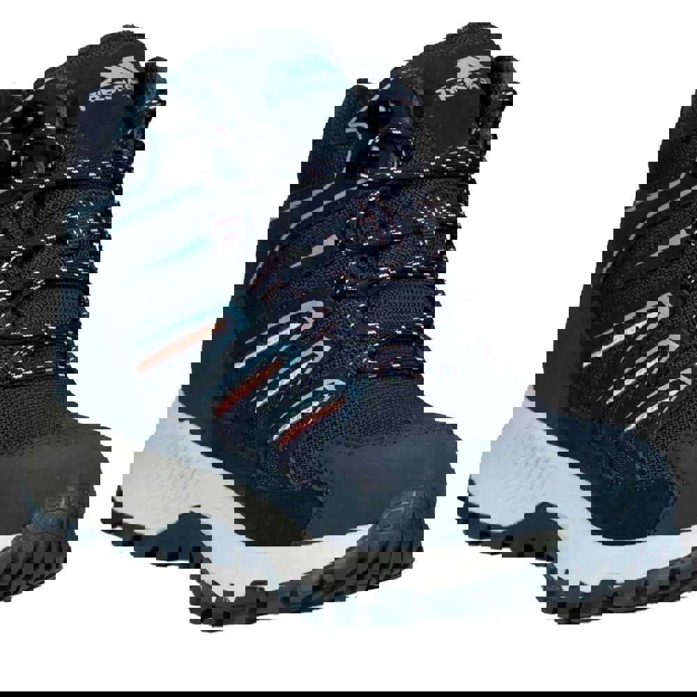 These Trespass Janick walking boots are built with a low cut and a flat profile, finished in navy with a logo and patterned design. The upper combines rubber, suede and textile, with a textile lining and a phylon midsole. A waterproof membrane is included as part of the fabric technology.