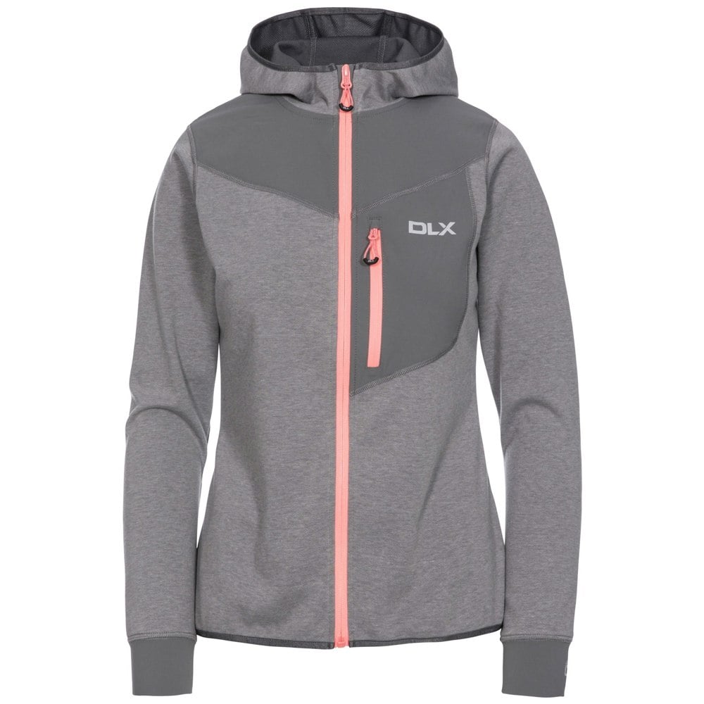 This women’s Jazmin DLX hoodie comes in Platinum Marl and uses two materials: fabric 1 in 75% polyester and 25% cotton, and fabric 2 in 84% polyamide and 16% elastane. The melange outer is backed with mesh, with woven contrast panels and cuffs for a defined finish.