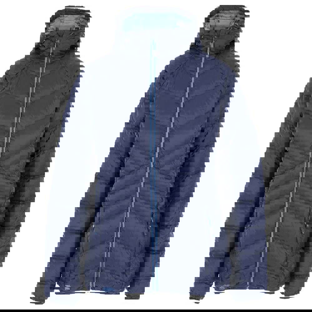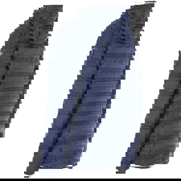 An ultra lightweight jacket with a grown-on hood and a contrasting lining. The shell and lining are made from 100% polyamide, with a filling of 90% down and 10% feather. A front zip fastens through the centre and is finished with contrast teeth detail, while matching binding at the cuffs and hem gives a clean edge.