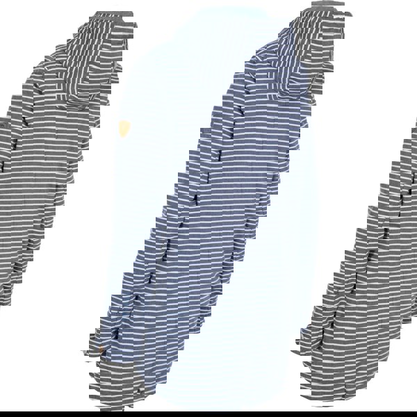 This women’s Offshore jacket is made with a shell of 60% polyester and 40% cotton with a TPU membrane, plus a lining of 50% cotton and 50% polyester. It comes in a yarn-dyed navy stripe with a chambray lining and a longer length, finished with leather trims.