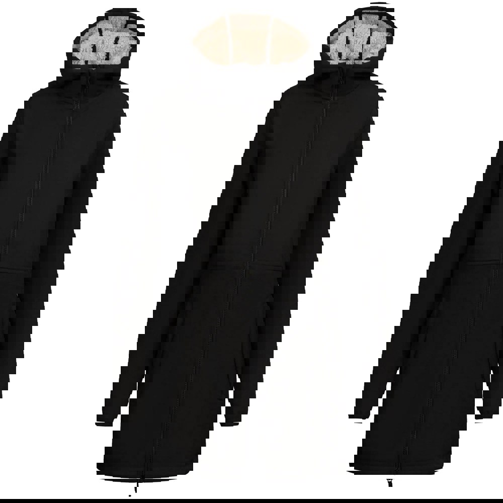 Made from 100% polyester, this softshell woven jacket is finished in black with contrast detailing and logo branding. A bonded faux fur lining adds an extra layer, while the hooded neckline includes an attached integral hood with a drawcord and sew-on construction.