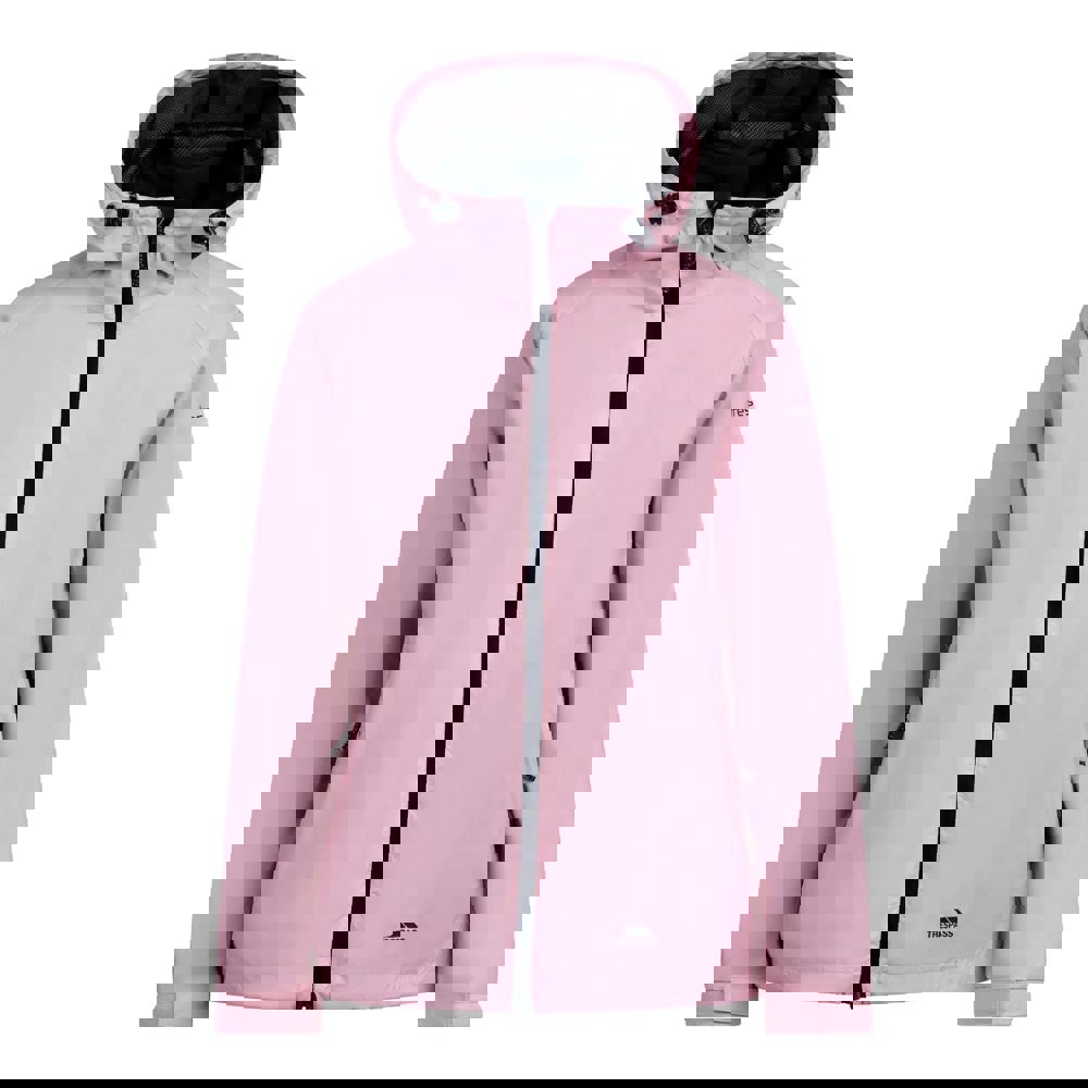 The Trespass Tayah II waterproof jacket in carnation is made with a woven outer of 100% polyamide with a PU-coated shell and a 100% polyester lining. A contrast mesh lining sits inside, alongside an inner storm flap and taped seams.