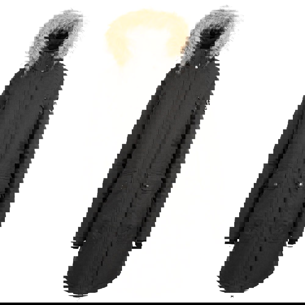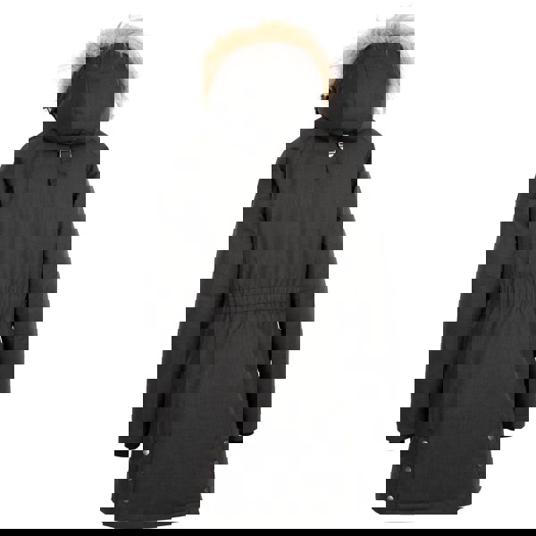 It fastens with a two-way zip and buttons, and includes inner knitted cuffs with long sleeves. Storage is arranged across multiple pockets, including zipped chest pockets, double-entry side pockets and inner pockets. The hood has a detachable faux fur trim.