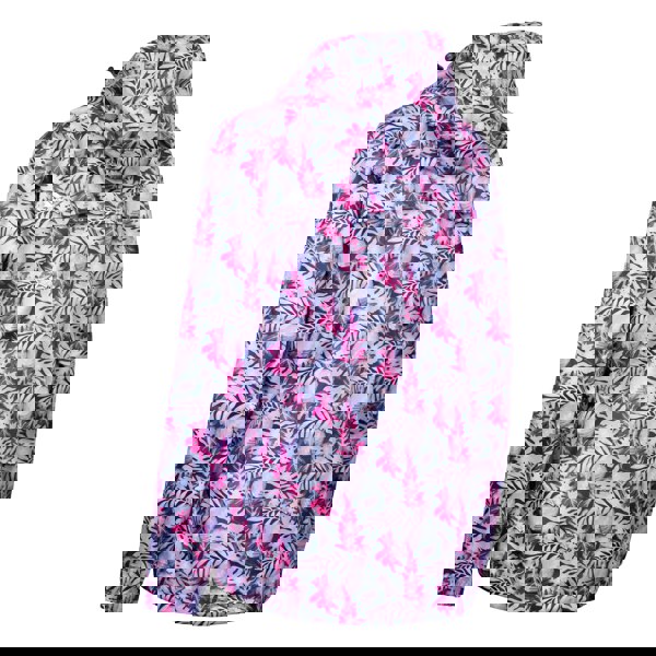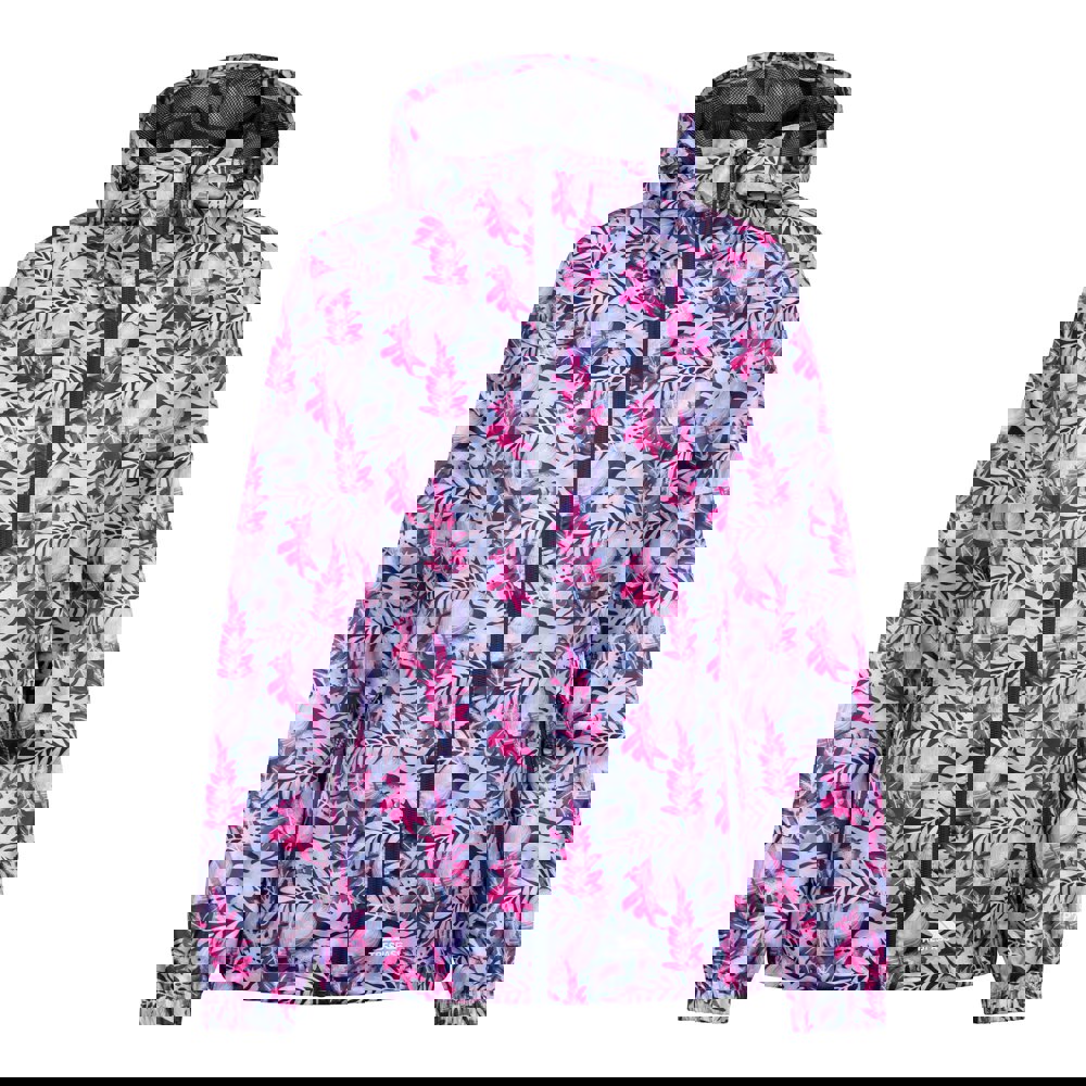 This packaway jacket comes in a pink and lilac all-over foliage print, with a hooded neckline and long sleeves. Made from 100% polyester with a PU coating, it is waterproof and windproof. The lining uses breathable contrast mesh, and back ventilation adds further airflow.
