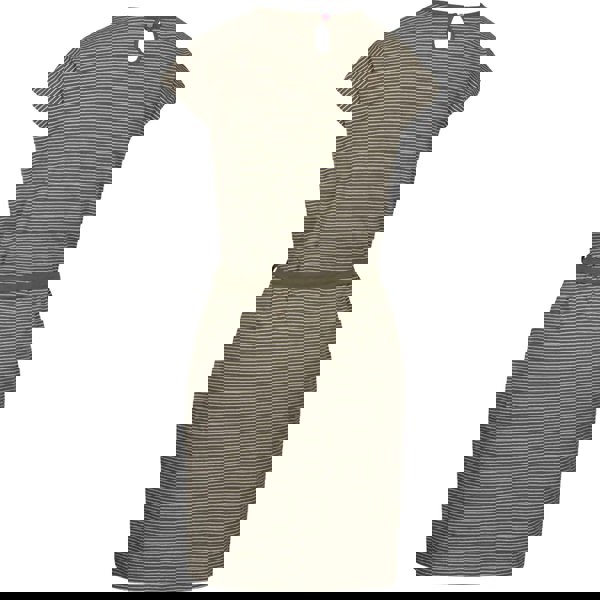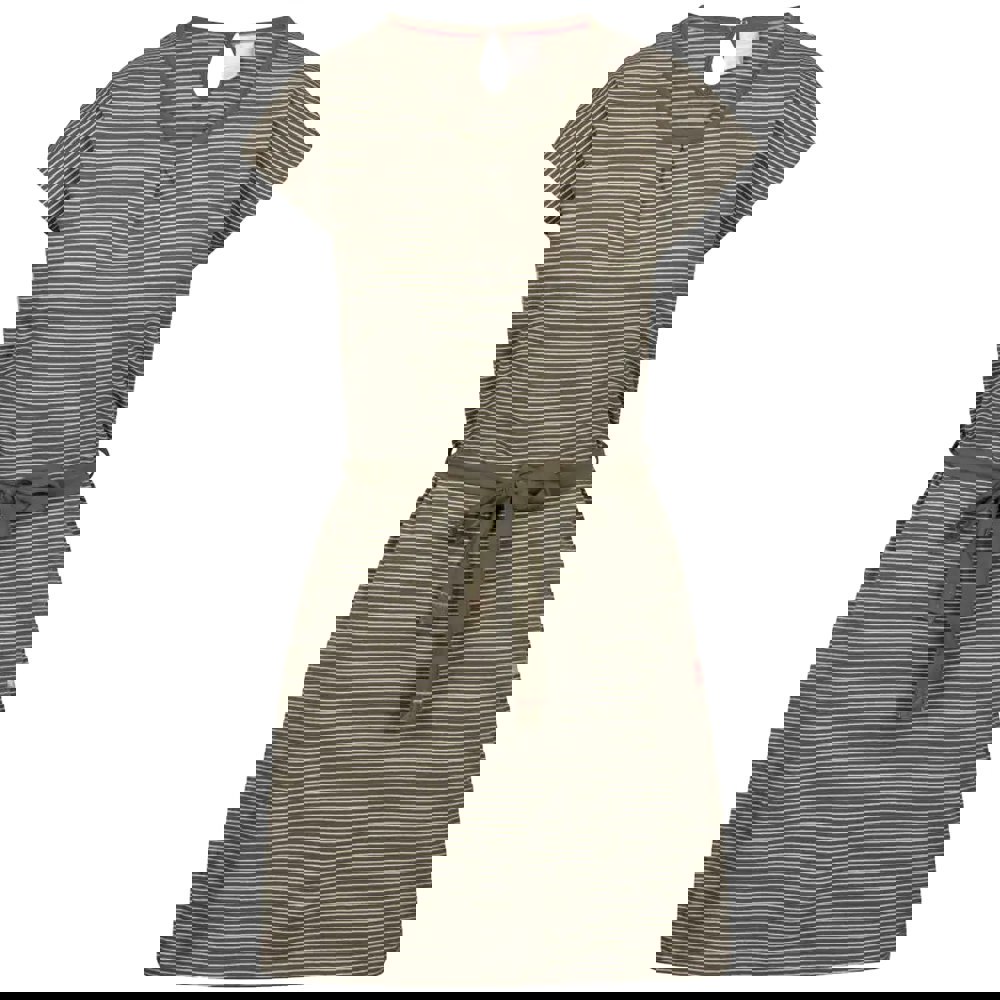 This knitted cotton-rich dress is made from 95% cotton and 5% elastane, finished with a yarn dyed stripe design. Cut in an A-line shape with an above-knee length, it has a round neck with pleated detailing and capped sleeves for a clean, structured look.