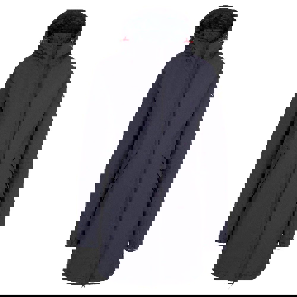 This women’s Overcast waterproof jacket is made with a Taslan shell and an outer of 100% polyamide with a PU coating. It is lined in 100% polyamide with a quilted finish and padded with 100% polyester for added insulation. The plain navy design is finished with a badge detail and a hooded neckline with a standing collar.