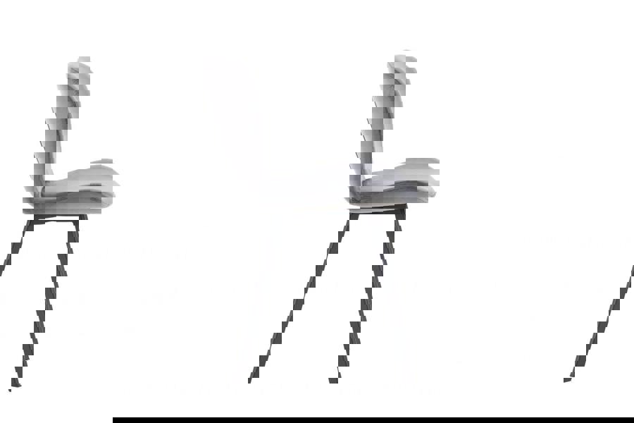 The chair has a compliant round design with a seat in grey polyester fabric and lightly flared chair legs in black metal.