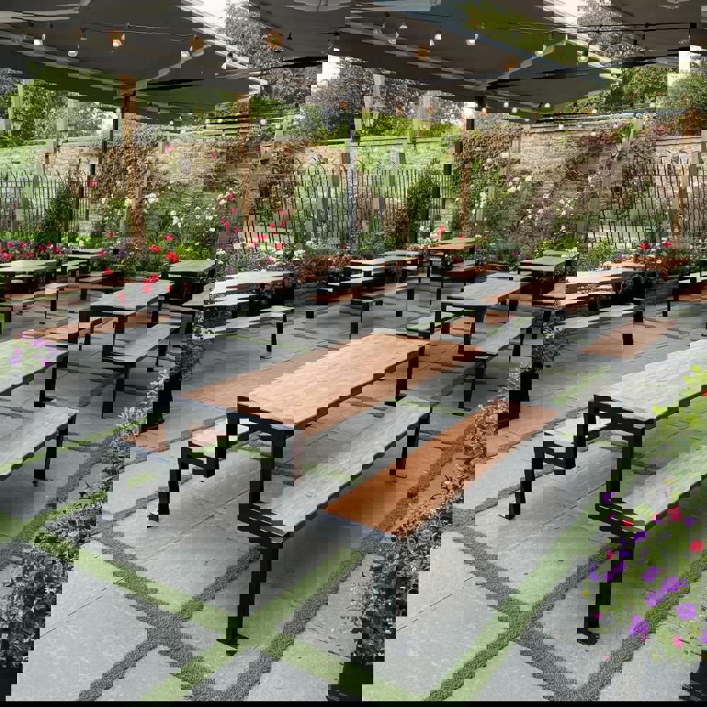 The timber is fully waxed and oiled for year-round protection, while the steel frame is professionally powder coated in any RAL colour you choose—default satin black. Powder-coated legs with screw-in feet are included for added stability and longevity.