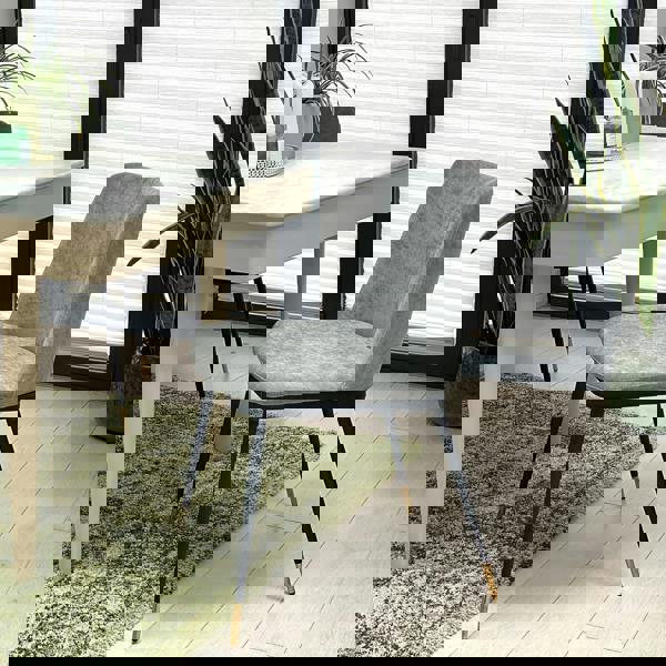 The Eclipse Luxe Chair – with Black Legs and Gold-Tipped Legs (set of 2) offers the perfect balance of modern style and everyday comfort. Upholstered in plush grey fabric, this dining chair features a cushioned seat and backrest, making it as practical as it is elegant.