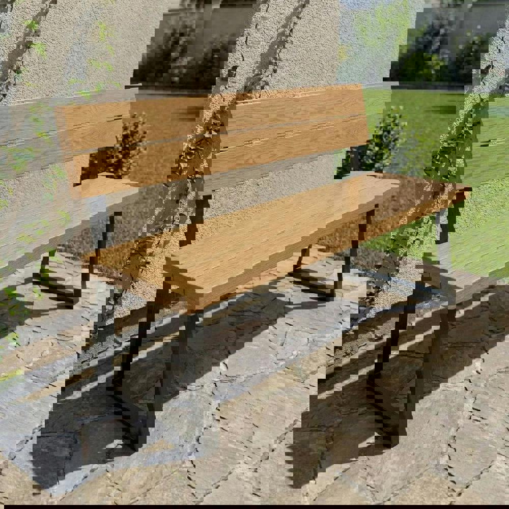 Built for strength and long-term outdoor durability, the bench features a fully welded steel frame handmade in-house by our master welders and finished in a tough outdoor powder coating. The oak is coloured with a water-based stain and sealed with three coats of extreme UV-resistant outdoor varnish to protect against sun and rain. Every Slatted Oak Outdoor Bench with Back is made to live outdoors and age beautifully over time.