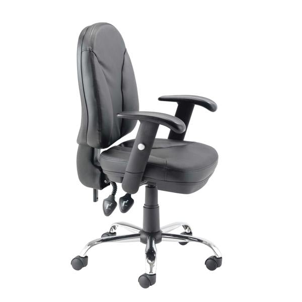 Enhance your workspace with the Stride Executive Office Chair, a premium addition to your office furniture collection. This stylish PU office chair features a generously padded seat and back, ensuring long-lasting comfort throughout your workday. The curved leather-look back promotes good posture, reducing strain and enhancing support. Its sleek chrome five-star base adds a touch of modern elegance, making it perfect for any professional or home office setting.