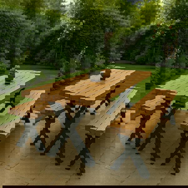 For a coordinated and practical setup, pair your table with our custom Iroko benches. Each bench is made **30cm