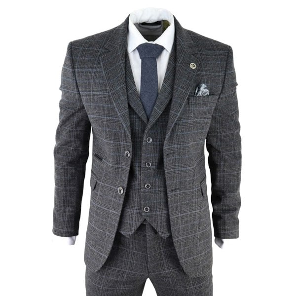 • Tweed Grey Prince Of Wales Blue Check Suit Finished In Wool Feel Premium Soft Fabric With a Turn Down Collar Waistcoat