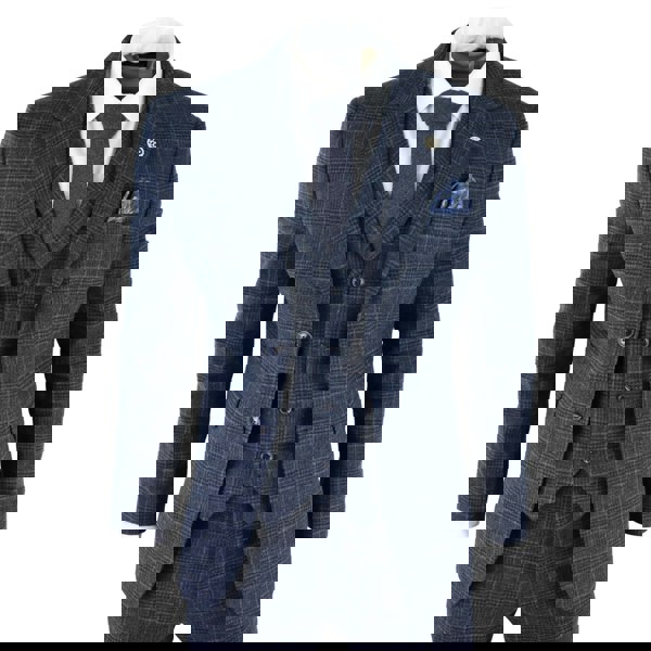 * Tweed Blue Prince Of Wales Navy Check Suit Finished In Wool Feel Premium Soft Fabric With a Turn Down Collar Waistcoat