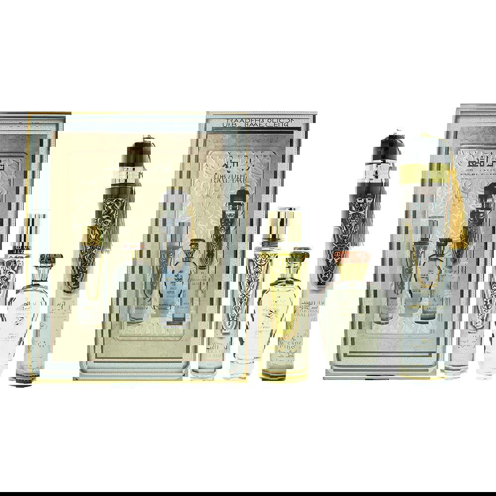 Ard Al Zaafaran Turab Al Dhahab is a three-piece fragrance set designed to scent both you and your space. Centred around a 100ml eau de parfum, it is paired with a 250ml perfume mist for lighter, more frequent refreshing, plus a 300ml air freshener to fragrance rooms and fabrics.