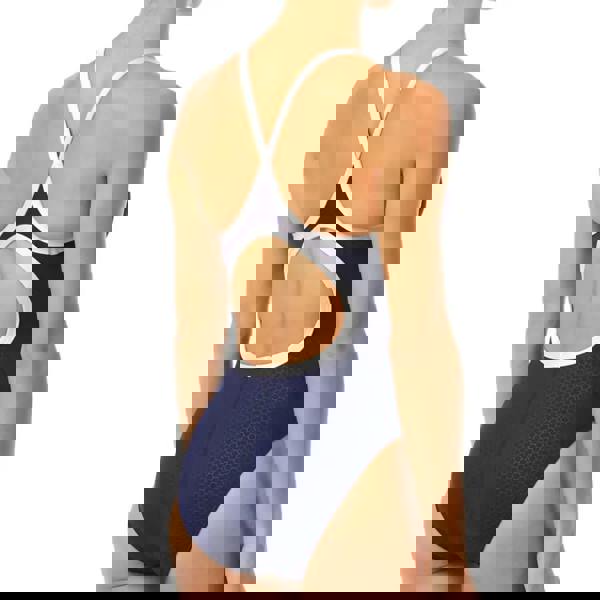This TYR HEXA Durafast Elite Diamondfit Swimsuit in classic navy with white trims, offers a hexagon, honeycomb style patterning with blue accents. This swimsuit is perfect for athletes looking for reliability, offering excellent freedom of movement with moderate coverage. With 300+ hours of performance and 100% chlorine-proof material, this comfortable swimsuit is designed to last and is ideal for leisure and training sessions!