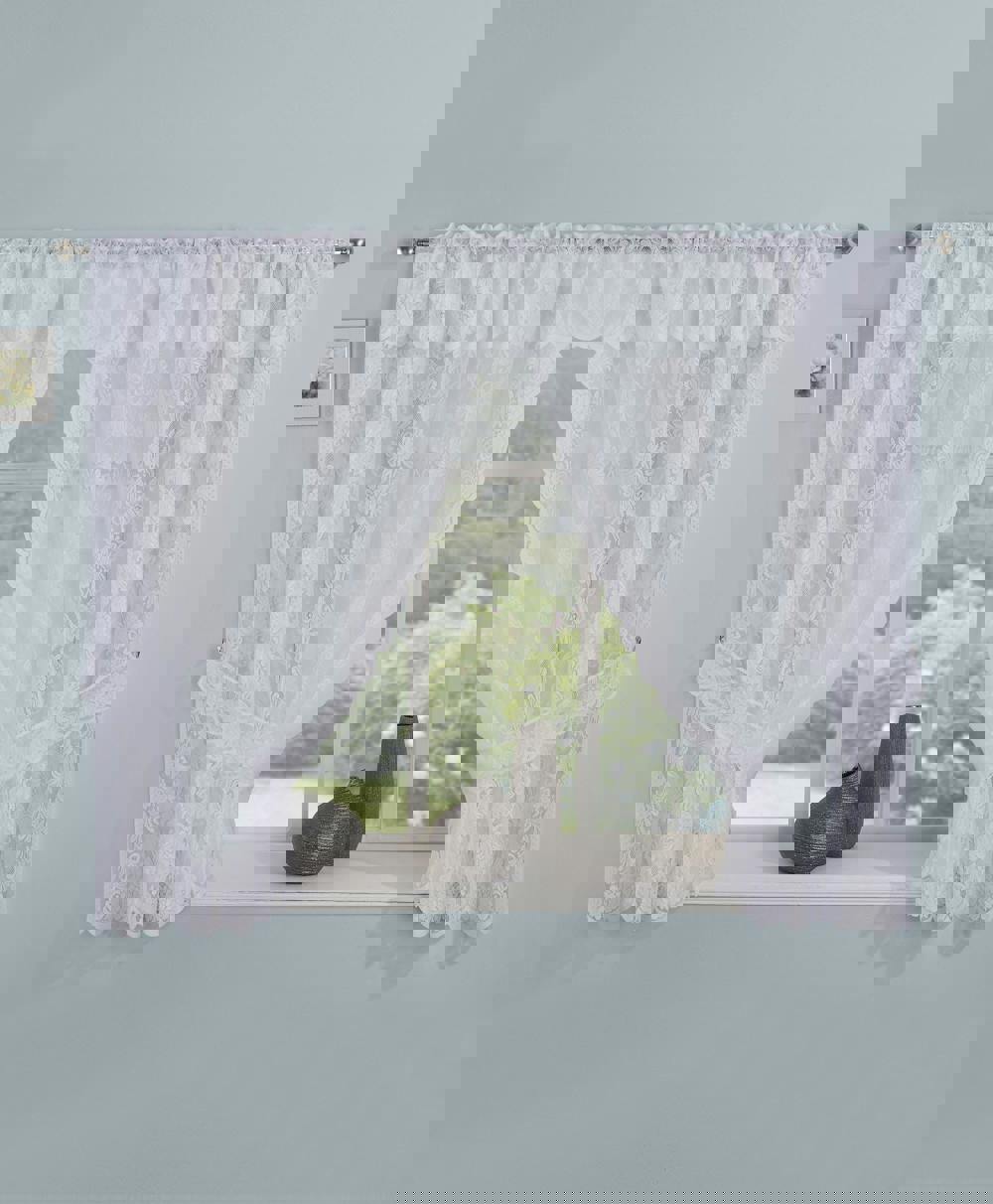 Introducing our Kew Lace Window Set with Rod Pocket Header – a charming blend of timeless elegance and delicate beauty, designed to adorn your windows with a touch of vintage-inspired grace. This window set features exquisite floral lace detailing and a convenient rod pocket header for easy installation.