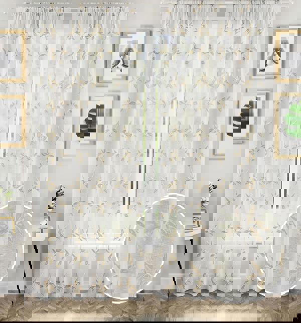 Oasis is a sheer voile panel with an all-over embroidered leaf pattern. The rod pocket header offers ease of hanging, making the panel perfect for any room. Available in two colours; grey, natural.