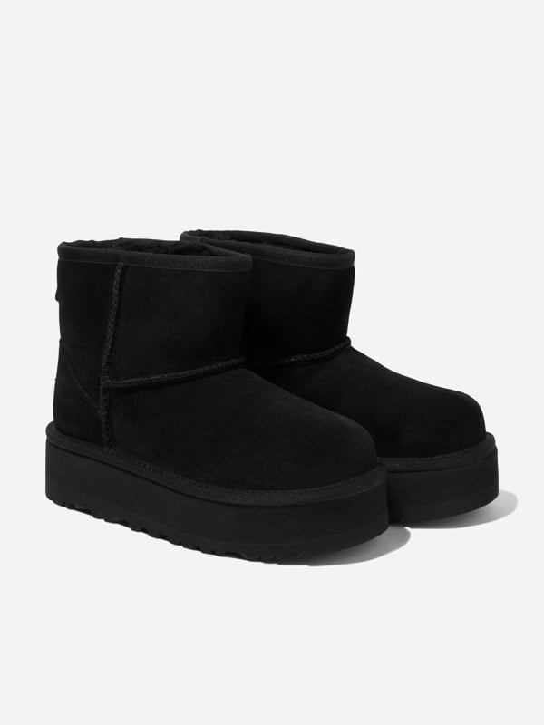 UGG Girls Classic Mini Platform Boots bring a classic mini silhouette with a raised platform profile. The suede upper is finished with overlock stitch detailing on the seams and a rear pull tab for easy handling. Inside, 17mm UGGplushTM combines 60% upcycled wool with 40% lyocell across the lining and insole, paired with a foam footbed. Underfoot, an EVA midsole and SugarSoleTM EVA outsole complete the build, with textile binding made from 100% recycled polyester fibres. A woven heel label with the UGG® logo signs off the back of the boot.